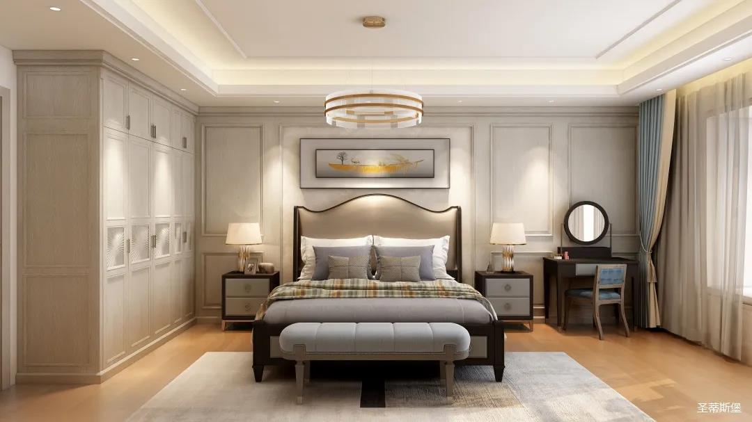 ▲卧室是居家的主要休息场所,在设计上需更注重舒适度。所以房间就以和谐淡雅的色彩为主,采用素雅柔和的线条布局,时尚轻奢的家具,使得空间更加的惬意和浪漫。床头层林尽染装饰画,让原本略偏美式淡雅的卧室在色彩上更添一笔。